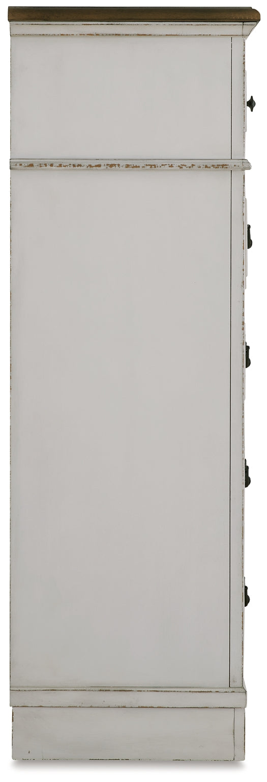 | Details | Made with hardwood solids, select wood veneer and MDF substrate, Two-tone finish (chipped white and brown wood-tone), Profiled drawer fronts and pilasters, Waist moulding, Metal hardware with dark bronze-tone finish, 5 smooth-gliding drawers with fully finished interiors, dovetail construction and metal ball-bearing side glides (top drawer felt lined), Assembly required | |